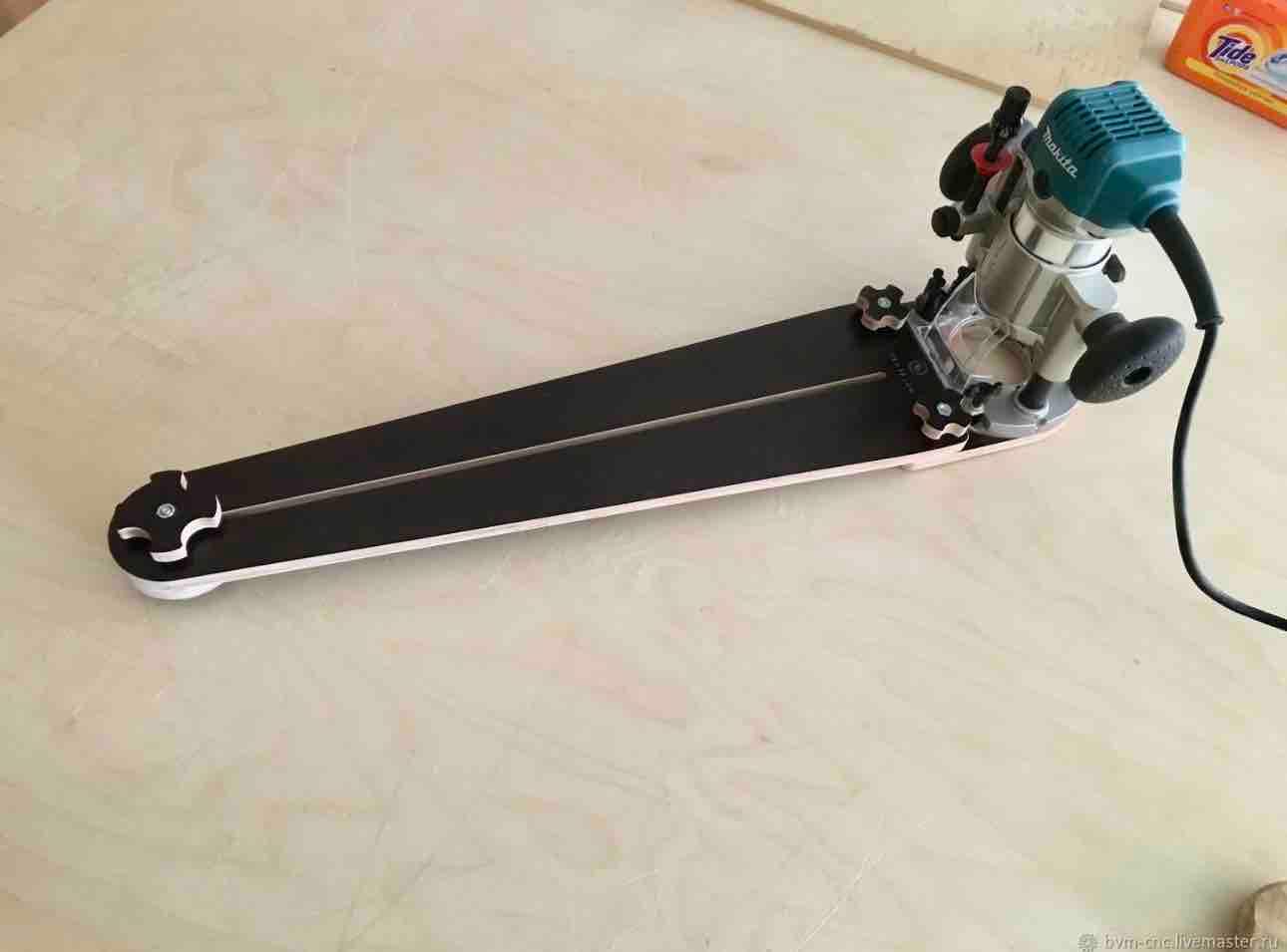 Изготавливаю под заказ 1 - 2 дней по предоплате 500 рублей остальные по факту готовности. Циркуль универсальный, для фрезера V2 Для изготовления заготовок разного диаметра. Версия V2 1000х2000 3500 рублей Радиус обрабатываемой поверхности максимальный от центра - 1000мм (диаметр - 2000мм) минимальный радиус 95мм (диаметр - 190) Вес приспособления 2,4кг Перечень под уже разработанные фрезера: 1. Makita - RT0700 2. Makita - 3060 3. DeWALT 26204k 4. Makita-rp-2301-fcx 5. Makita - 3612С 6. Makita - 2300FC 7. Makita - 1110C 8. BOSCH - POF 1200 AE 9. ЭНКОР - ФМЕ-8508Э 50263 10. BOSCH GKF 550 11. Циркуль BOSCH GOF 130 12. ФИОЛЕНТ МФ2-620Э - МФ3-1100Э Изготовлен из влагостойкой ламинированной фанеры F/F12мм, на ЧПУ фрезерном станке. Можно изготовить под любой фрезер (под заказ по вашим размерам 600 рублей ), для этого нужны размеры подошвы вашего фрезера и размер крепления подошвы (по центрам между центрами винтов крепления подошвы), (все тонкости заказа по телефону или на почту).