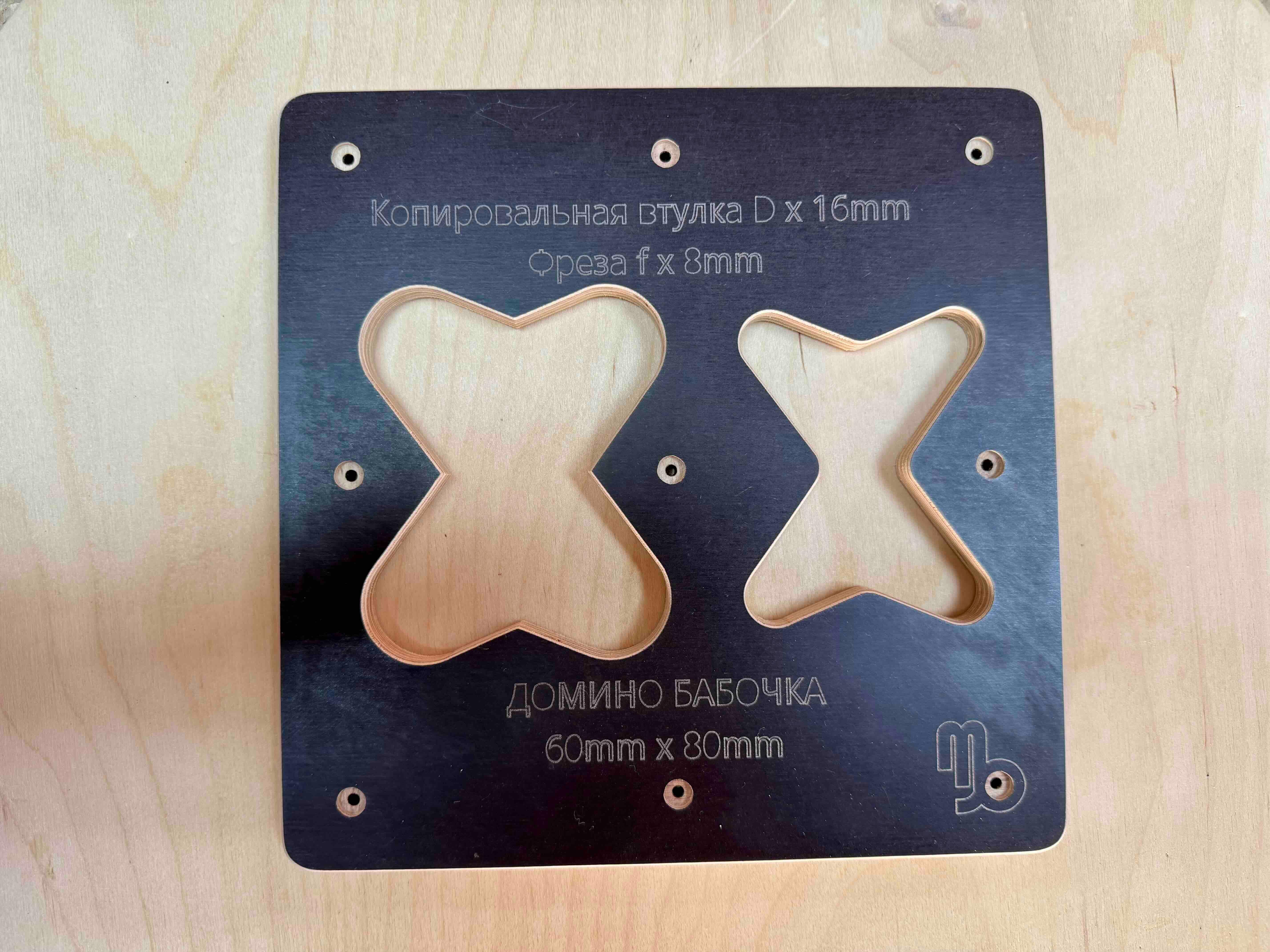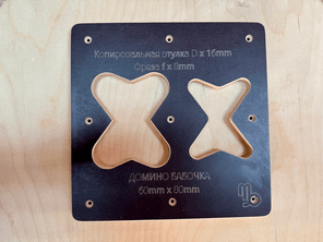 Шаблон Домино-Бабочка Декоративное накладное соединение Отличный помощник для профессионалов так и для начинающих столяров. Есть всегда в наличии или изготовлю под заказ. Шаблон рассчитан под копировальную втулку d x 16 и режущий инструмент фрезу от 8mm. Версия V1 Размер Бабочки-Домино - Копировальная втулка D x 16 f х 8: 1. Бабочка-Домино 60mm х 80mm d x 16, f x 8 Преимущества: 1. Экономия материала 2. Быстрота изготовления врезания паза и изготовления Домино-Бабочки 3. Экономия времени и денег на покупку дорогостоящего оборудования 4. Можно использовать любой ручной фрезер. (фрезер в комплект не входит) 5. Материал шаблона изготовлен из влагостойкой ламинированной фанеры 12мм на ЧПУ. 6. Габаритные размеры шаблона с одним видом домино: Длина - 240mm Ширина - 240mm Толщина - 12mm Вес 360г 7. Крепится варианты: а) струбцинами к заготовке б) двухсторонний скотч в) можно саморезами