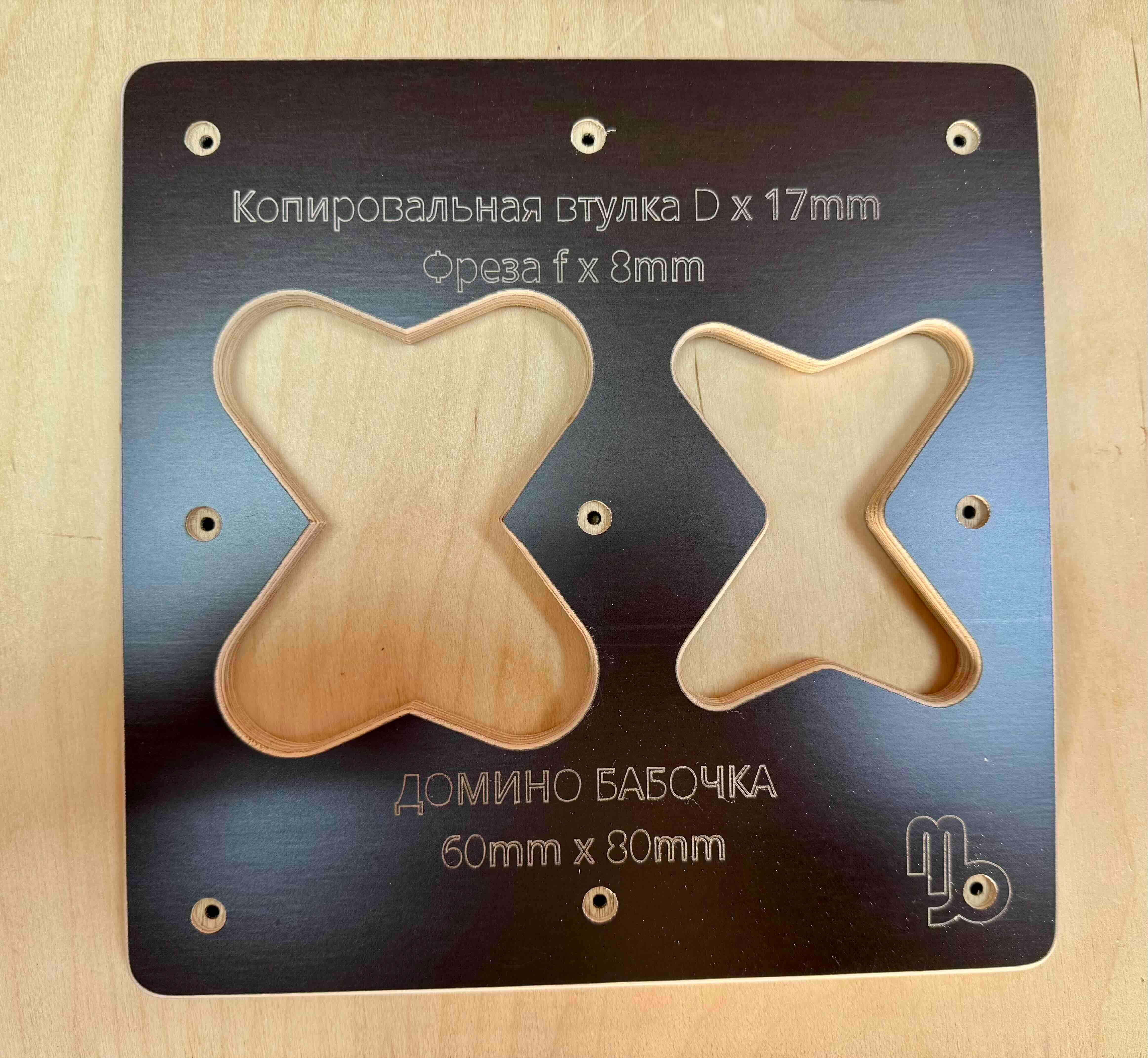 Шаблон Домино-Бабочка Декоративное накладное соединение Отличный помощник для профессионалов так и для начинающих столяров. Есть всегда в наличии или изготовлю под заказ. Шаблон рассчитан под копировальную втулку d x 17 и режущий инструмент фрезу от 8mm. Версия V1 Размер Бабочки-Домино - Копировальная втулка D x 17 f х 8: 1. Бабочка-Домино 60mm х 80mm d x 17, f x 8 Преимущества: 1. Экономия материала 2. Быстрота изготовления врезания паза и изготовления Домино-Бабочки 3. Экономия времени и денег на покупку дорогостоящего оборудования 4. Можно использовать любой ручной фрезер. (фрезер в комплект не входит) 5. Материал шаблона изготовлен из влагостойкой ламинированной фанеры 12мм на ЧПУ. 6. Габаритные размеры шаблона с одним видом домино: Длина - 240mm Ширина - 240mm Толщина - 12mm Вес 360г 7. Крепится варианты: а) струбцинами к заготовке б) двухсторонний скотч в) можно саморезами