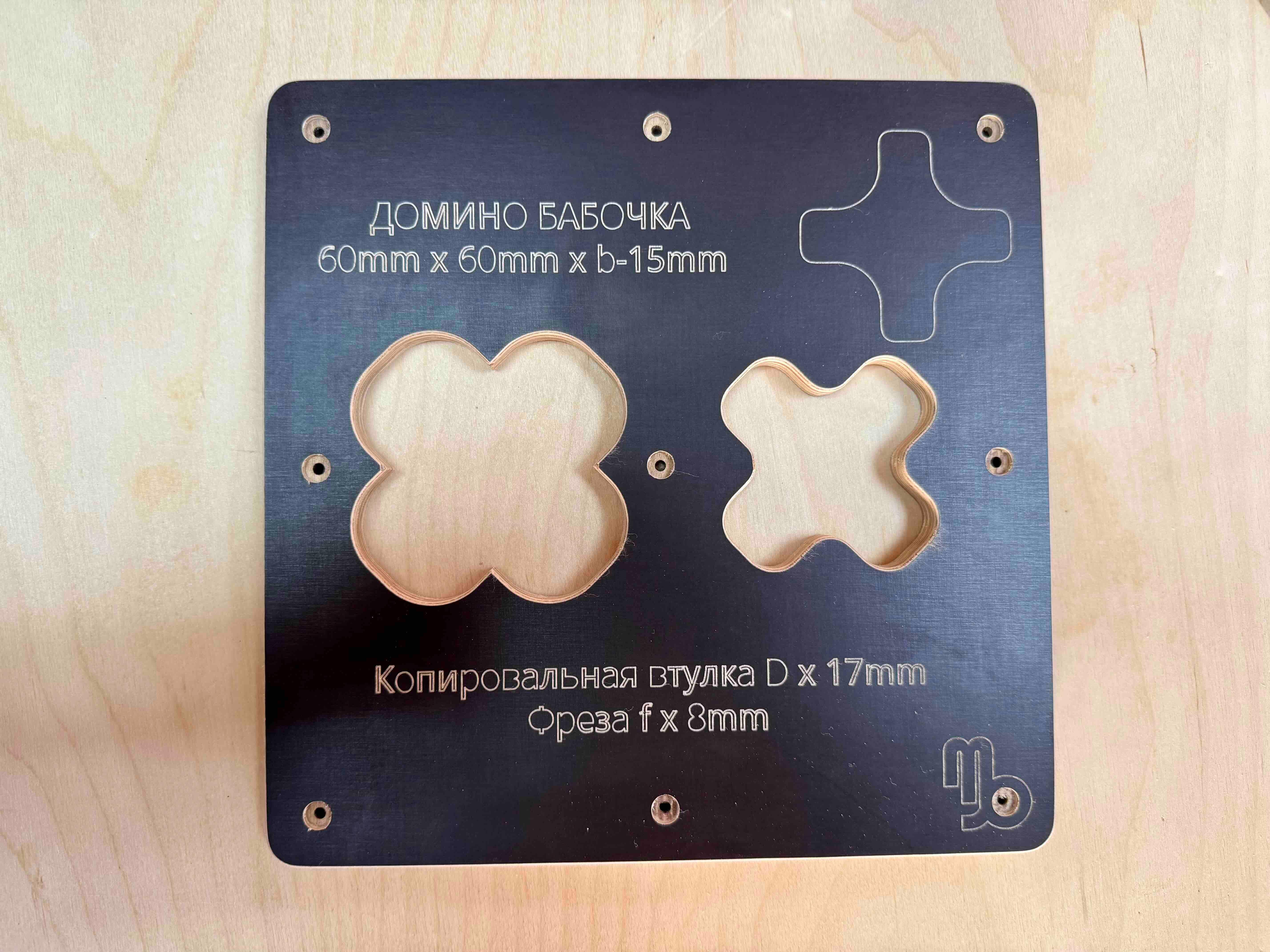 Шаблон Домино-Бабочка Декоративное накладное соединение Отличный помощник для профессионалов так и для начинающих столяров. Есть всегда в наличии или изготовлю под заказ. Шаблон рассчитан под копировальную втулку d x 17 и режущий инструмент фрезу 8mm. Версия V3 (Крестик) Размер Бабочки-Домино - Копировальная втулка D x 17 f х 8: 1. Бабочка-Домино 60mm х 60mm d x 17, f x 8 Преимущества: 1. Экономия материала 2. Быстрота изготовления врезания паза и изготовления Домино-Бабочки 3. Экономия времени и денег на покупку дорогостоящего оборудования 4. Можно использовать любой ручной фрезер. (фрезер в комплект не входит) 5. Материал шаблона изготовлен из влагостойкой ламинированной фанеры 12мм на ЧПУ. 6. Габаритные размеры шаблона с одним видом домино: Длина - 240mm Ширина - 240mm Толщина - 12mm Вес 360г 7. Крепится варианты: а) струбцинами к заготовке б) двухсторонний скотч в) можно саморезами