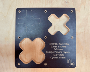 Шаблон Домино-Бабочка Декоративное накладное соединение Отличный помощник для профессионалов так и для начинающих столяров. Есть всегда в наличии или изготовлю под заказ. Шаблон рассчитан под копировальную втулку d x 16 и режущий инструмент фрезу от 8mm. Версия V3 (Крестик) Размер Бабочки-Домино - Копировальная втулка D x 16 f х 8: 1. Бабочка-Домино 80mm х 80mm d x 16, f x 8 Преимущества: 1. Экономия материала 2. Быстрота изготовления врезания паза и изготовления Домино-Бабочки 3. Экономия времени и денег на покупку дорогостоящего оборудования 4. Можно использовать любой ручной фрезер. (фрезер в комплект не входит) 5. Материал шаблона изготовлен из влагостойкой ламинированной фанеры 12мм на ЧПУ. 6. Габаритные размеры шаблона с одним видом домино: Длина - 240mm Ширина - 240mm Толщина - 12mm Вес 360г 7. Крепится варианты: а) струбцинами к заготовке б) двухсторонний скотч в) можно саморезами