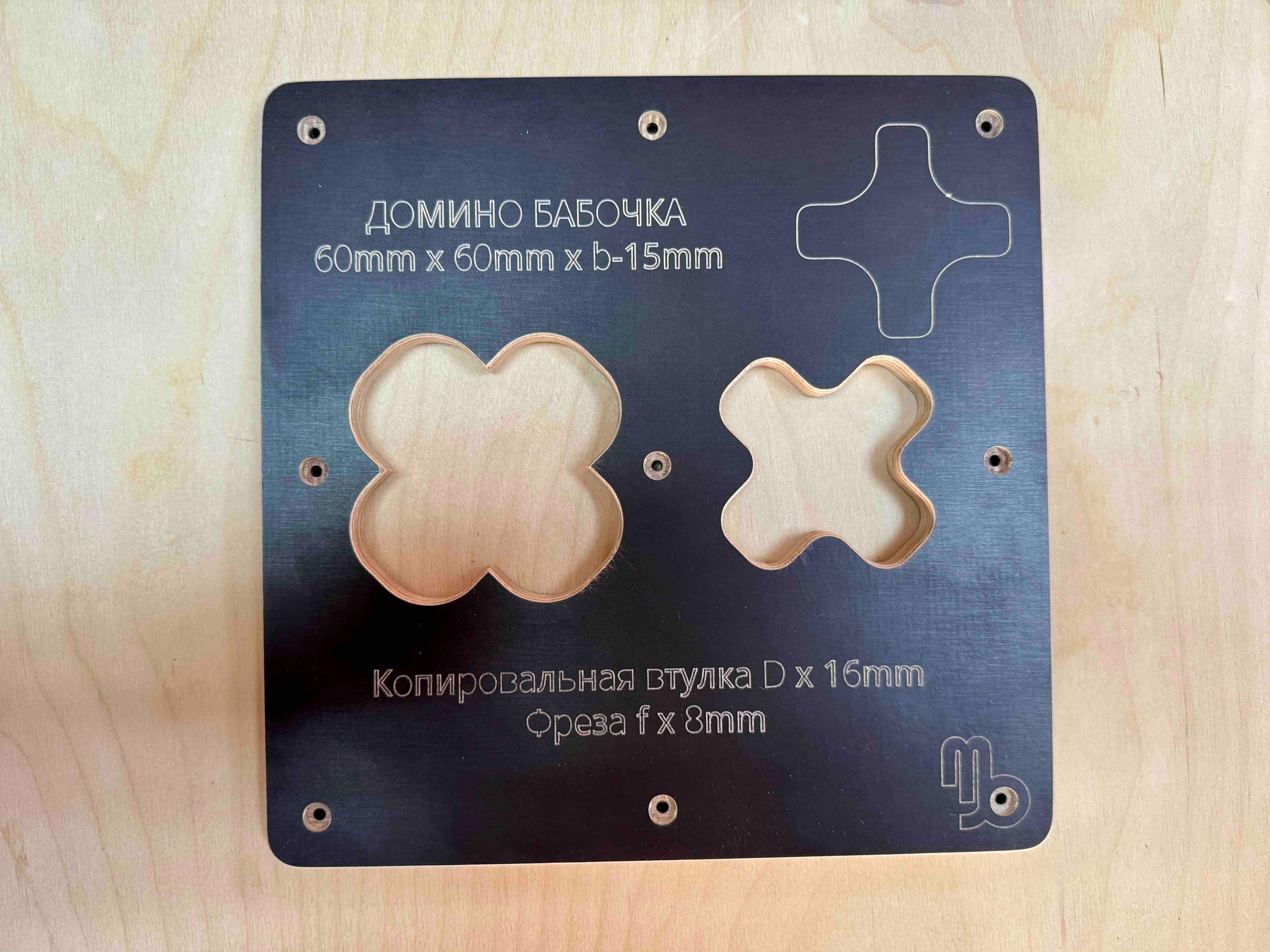 Шаблон Домино-Бабочка Декоративное накладное соединение Отличный помощник для профессионалов так и для начинающих столяров. Есть всегда в наличии или изготовлю под заказ. Шаблон рассчитан под копировальную втулку d x 17 и режущий инструмент фрезу от 8mm. Версия V3 (Крестик) Размер Бабочки-Домино - Копировальная втулка D x 17 f х 8: 1. Бабочка-Домино 60mm х 60mm d x 17, f x 8 Преимущества: 1. Экономия материала 2. Быстрота изготовления врезания паза и изготовления Домино-Бабочки 3. Экономия времени и денег на покупку дорогостоящего оборудования 4. Можно использовать любой ручной фрезер. (фрезер в комплект не входит) 5. Материал шаблона изготовлен из влагостойкой ламинированной фанеры 12мм на ЧПУ. 6. Габаритные размеры шаблона с одним видом домино: Длина - 240mm Ширина - 240mm Толщина - 12mm Вес 360г 7. Крепится варианты: а) струбцинами к заготовке б) двухсторонний скотч в) можно саморезами