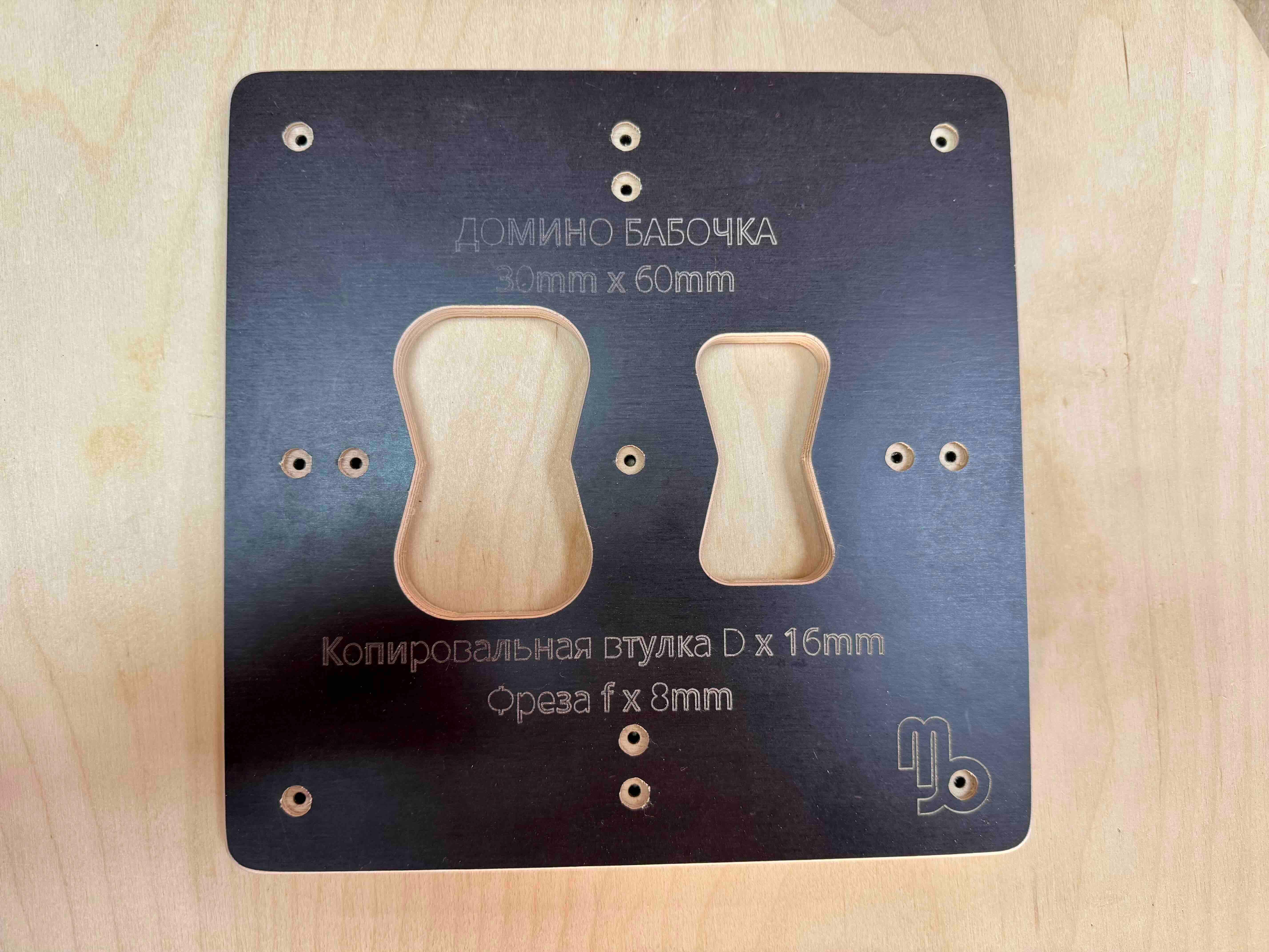 Шаблон Домино-Бабочка Декоративное накладное соединение Отличный помощник для профессионалов так и для начинающих столяров. Есть всегда в наличии или изготовлю под заказ. Шаблон рассчитан под копировальную втулку d x 16 и режущий инструмент фреза 8mm. Версия V1 Размер Бабочки-Домино - Копировальная втулка D x 16 f х 8: 1. Бабочка-Домино 30mm х 60mm d x 16, f x 8 Преимущества: 1. Экономия материала 2. Быстрота изготовления врезания паза и изготовления Домино-Бабочки 3. Экономия времени и денег на покупку дорогостоящего оборудования 4. Можно использовать любой ручной фрезер. (фрезер в комплект не входит) 5. Материал шаблона изготовлен из влагостойкой ламинированной фанеры 12мм на ЧПУ. 6. Габаритные размеры шаблона с одним видом домино: Длина - 240mm Ширина - 240mm Толщина - 12mm Вес 360г 7. Крепится варианты: а) струбцинами к заготовке б) двухсторонний скотч в) можно саморезами